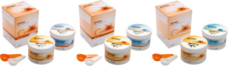 AFFINIS® Putty soft ist der Klassiker im Sortiment der AFFINIS®-Knetmassen. Angenehmes und einfach schnelles Anmischen zeichnen die aufeinander abgestimmten Konsistenzen von Basis und Katalysator aus. AFFINIS® Putty super soft ist ein besonders geschmeidiges Knetmaterial, welches sich ganz leicht homogen anmischen lässt. Dieses Material eignet sich besonders gut für alle Doppelmischtechniken.