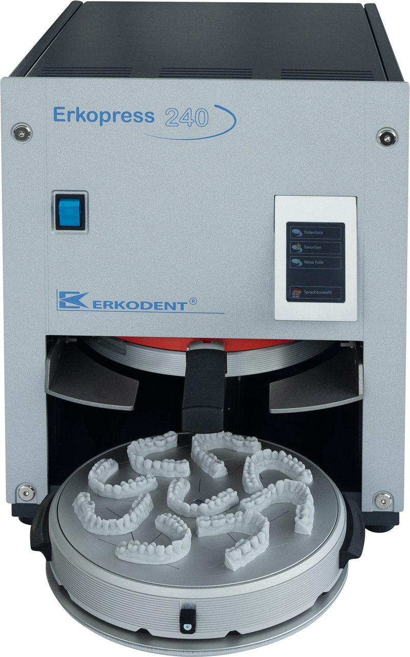 Druckformgerät mit automatisiertem Tiefziehvorgang für bis zu 6 Modelle mit Sockel und für bis zu 9 Modelle ohne Sockel, zum Anschluss an das vorhandene Druckluftsystem.