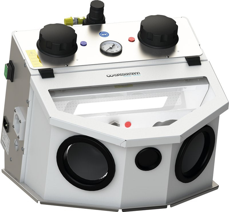 Das WASSERMANN Präzisions-Feinstrahlgerät Puna bietet Ihnen höchste Qualität und ausgereifte Technologie. Es ist ein 2-Kammer-Gerät. Es dient zum Abstrahlen, Aufrauen oder Glanzstrahlen. Das Gerät arbeitet präzise und ist wartungsarm. Spürbar geringer Strahlmittelverbrauch durch das von Wassermann entwickelte Luftmischsystem.