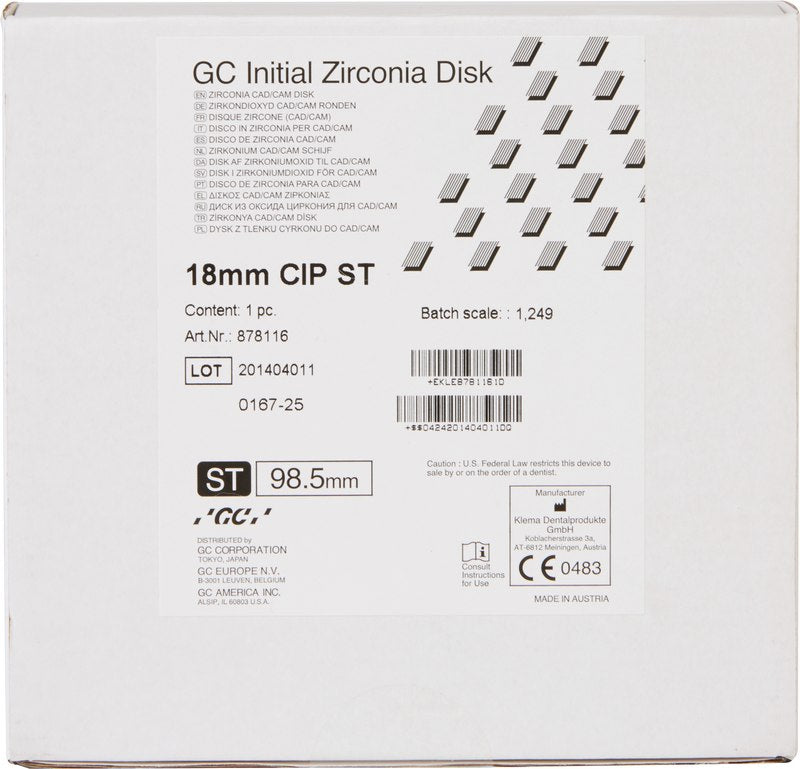 Als Erweiterung unseres GC Initial Portfolios bieten wir die entsprechenden, qualitativ sehr hochwertigen Zirkonscheiben (Durchmesser 98,5mm) an. Die CIP -Cold Isostatic Pressed- Initial Zirkonscheiben verfügen über optimierte physikalische Eigenschaften. Zwei unterschiedliche Disk-Typen stehen zur Auswahl