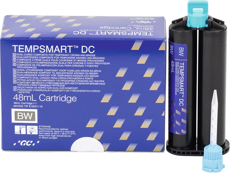 Dualhärtendes Material für provisorische Kronen & Brücken Schnell und effizient zur finalen Restauration Seine Kompetenz und Erfahrung im Bereich der provisorischen Materialien hat GC bereits seit langem mit der äußerst erfolgreichen Unifast Produktreihe unter Beweis gestellt. GC ist stolz darauf, eine echte Weiterentwicklung präsentieren zu können, die im Bereich der temporären Kronen und Brücken etwas völlig Neues bietet. Mit TEMPSMART™ DC führt GC eine neue Technologie ein, durch die Sie das erste dualhärtende und weichmacherfreie Material nutzen können. Entwickelt wurde es durch den einzigartigen Einsatz der Technologiekombination von Netzwerken aus langen Polymerketten mit ultrafeinen MFR-Füllstoffen - das Ergebnis ist ein hochmodernes Material für Provisorien. Es zeichnet sich durch nicht klebende und glatte Oberflächen ohne Inhibitionsschicht aus, perfekt für eine schnelle Politur und hohe Bruchfestigkeit für großspannige Brücken.