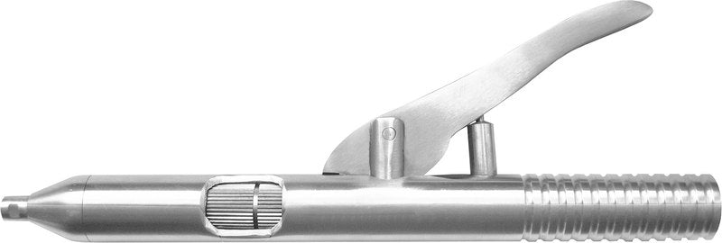Dieser Kronenentferner zeichnet sich besonders durch die Möglichkeit rasch aufeinanderfolgender Auslösung der Schlagimpulse aus. Über den Handgriff werden die Impulse ohne umstäündliches Nachspannen allein durch Drücken ausgelöst. Ansätze sterilisierbar.