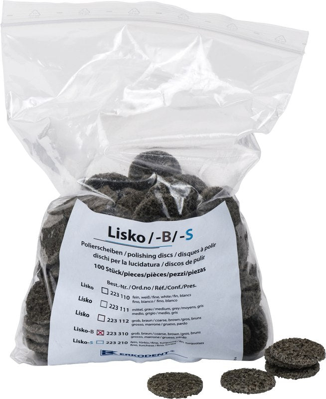 Die Körnung entspricht Lisko braun. Durch die gebundene Struktur hat Lisko-B eine wesentlich längere Lebensdauer. Auch dicke, harte Schienen (z. B. Erkodur und Erkolo-pro 3-5 mm) können damit zugeschliffen, vorpoliert und ohne kantige oder flächige Schleifspuren ausgearbeitet werden. Anschließend mit Lisko-S die Feinpolitur fortsetzen.