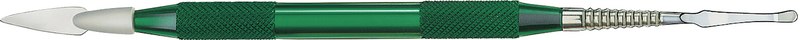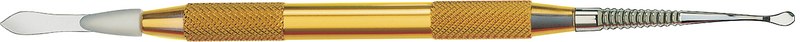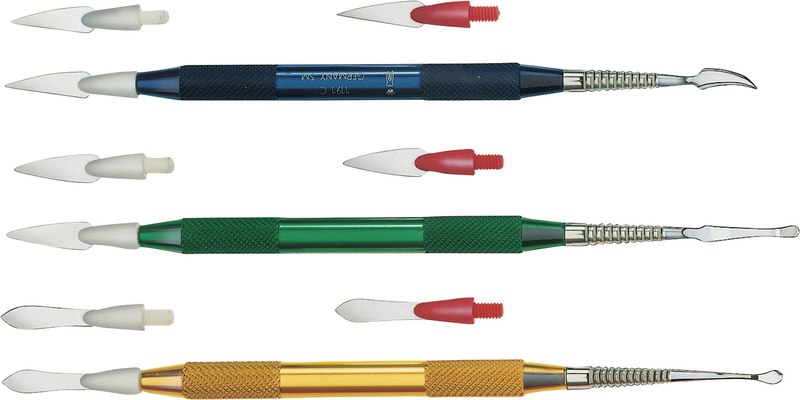 Diese äußerst feinen Instrumente mit ihren Federmessern (0,2 mm + 0,12 mm) erlauben ein exaktes und angenehmes Arbeiten. Die Keramikmasse lässt sich in jeder gewünschten Stärke aufbauen und verdichten. Auch Verblendkunststoffe lassen sich bestens modellieren.