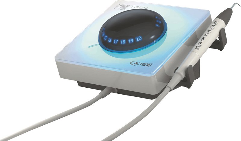 Gerät mit Newtron® SLIM B.LED Handstück (blauer und weißer LED-Lichtring) und Kabel, Kit Plaque-Indikator F.L.A.G.™ for B.LED (5 x 1,5 ml), autoklav. Universalschlüssel, Spitze Nr. 1, fest angeschlossenem Fußschalter, Zubehör für die Inbetriebnahme, Frequenzbereich: 28 - 36 kHz, Spülung: an die Trinkwasserversorgung anschließbar, Druck: 1 bis 5 bar, Gewicht Handstück: 48 g, Handstückkabel: 2,04 m, Gewicht Gerät: 1.650 g, Abmessungen: 155 x 185 x 100 mm (L x B x H)