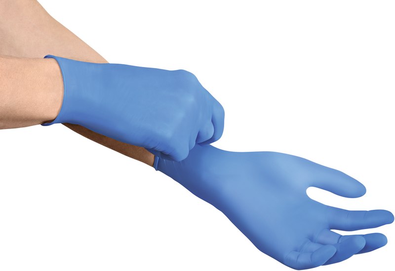 Latexfreie, sterile Einmal-Untersuchungs- und Schutzhandschuhe aus weichem, blau gefärbtem Nitrilkautschuk; puderfrei, durch chlorierte Innenbeschichtung leicht anzuziehen, texturierter Fingerbereich für optimale Griffigkeit, hochelastisch und besonders reißfest, hervorragende Passform und ausgezeichnetes Tastempfinden, paarweise verpackt.
