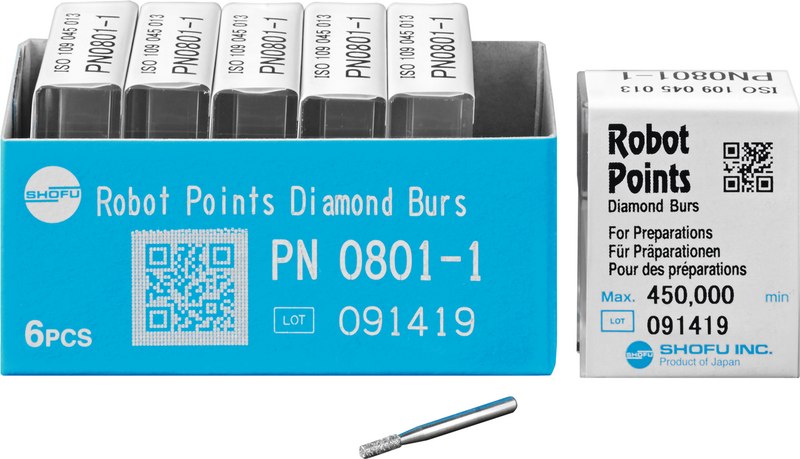 Robot Points FG - Präzisionsdiamanten für die Kavitäten- / Kronenstumpfpräparation und minimalinvasive Therapie. Exakt dosierte Mengen natürlicher Diamantpartikel werden gleichmäßig auf einem einteiligen Rohling aus gehärtetem, rostfreiem Stahl verteilt. Das optimale Verhältnis zwischen dem herausragenden und eingebundenen Teil des Diamantkorns sorgt für ein vibrationsarmes Schleifen und höchste Standzeit. Körnungen Neben den standardgekörnten Robot Points FG (S, ohne Schaftmarkierung) gibt es eine Auswahl von supergroben (X, schwarze Schaftmarkierung), groben (C, grüne Schaftmarkierung), feinen (F, rote Schaftmarkierung) und extrafeinen (V, gelbe Schaftmarkierung) Diamanten. Vorteile