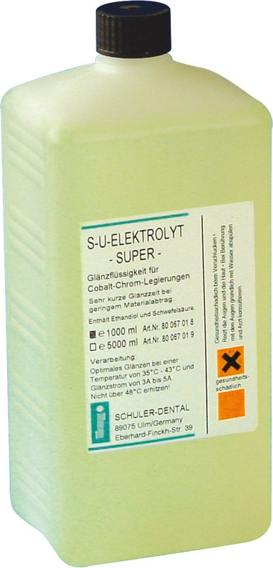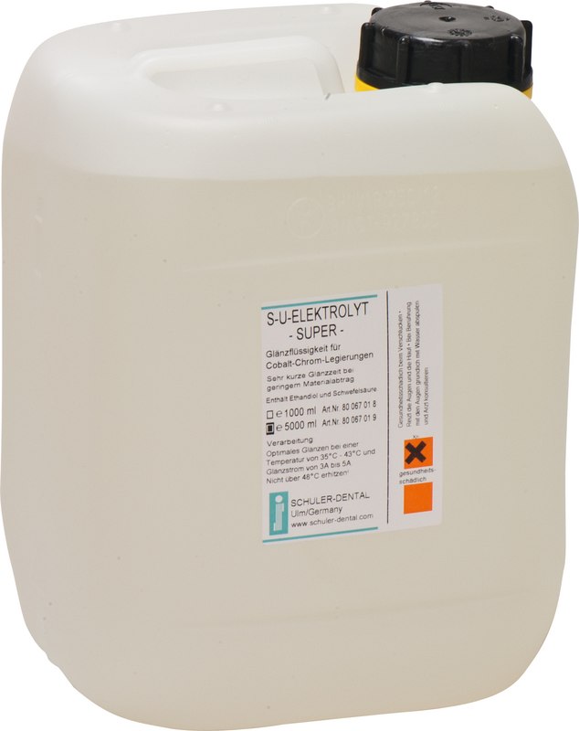 Glänzflüssigkeit für Co-Cr-Legierungen. Zusätzliche Komponenten ermöglichen selbst bei totalen OK-Modellgüssen eine vollständig glänzende Oberfläche bei verkürzter Glänzzeit und geringem Materialabtrag. Optimale Glänzleistung bei einer Temperatur von 35° - 45 °C und Glänzstrom von 3 bis 4 A.