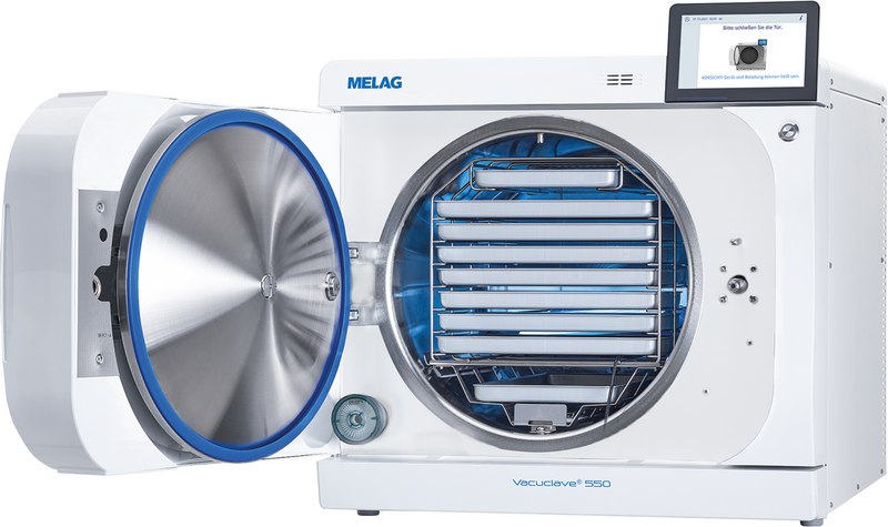 Vacuclave 550 überzeugt mit einer extragroßen Kammer für bis zu 25 kg Beladung und 16 Tabletts. Mit einer Kapazität von 50 Litern, bietet
