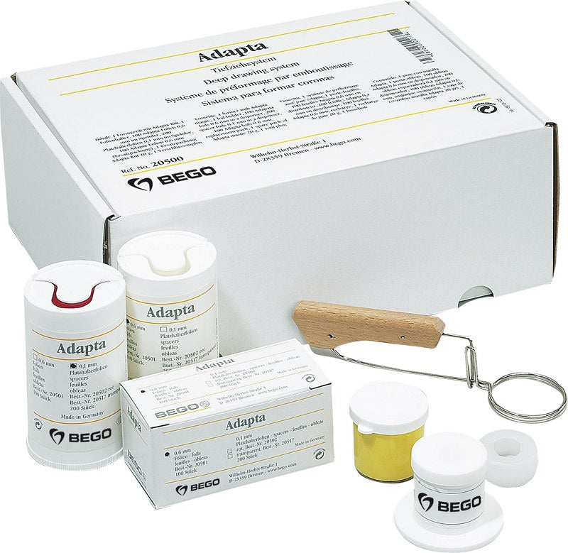 Für einfaches und präzises Tiefziehen von Kronenkäppchen. Eine gleichmäßige Mindestwandstärke sorgt für eine hohe Stabilität der Kronenkäppchen. Ideal für die Doppelkronentechnik, mit Fräswachs überzogen bietet das Adapta-Käppchen hohe Sicherheit gegen unbeabsichtigtes Durchfräsen bis auf den "Zahn"-Stumpf. Die systematisch eingesetzte 0,1 mm dünne Unterziehfolie schafft den notwendigen, definierten Freiraum für das Befestigungsmaterial.