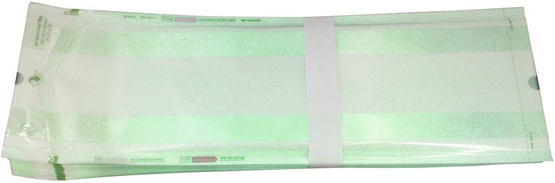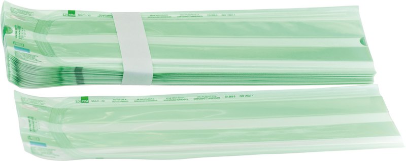 Beutel mit Seitenfalte für größere Gegenstände. Mit aufgedrucktem Prozessindikator für Dampf-, EO- und FO-Sterilisation. Beim Verschließen von Beuteln mit Seitenfalte dürfen an der Siegelkante keine Knitter entstehen. Beim Öffnen von Beuteln mit Seitenfalte muss darauf geachtet werden, dass an den Seitenfalten keine Risse entstehen.