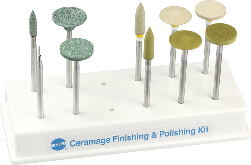 Ceramage Finishing & Polishing Kit für Mikro-Hybridkomposite mit einem hohen keramischen Füllstoffgehalt. Das Sortiment enhält alle wichtigen rotierenden Instrumente für die systematische Ausarbeitung und Politur von Ceramage, Ceramage UP und hochgefüllten Mikro-Hybridkompositen. Die Auswahl der Formen ermöglicht auch die Bearbeitung von okklusalen oder interdentalen Bereichen.