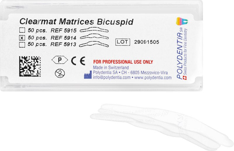 Die vorgeformten, transparenten Polyester-Matrizen erlauben eine vollständige Aushärtung von allen MOD-Kompositfüllungen im approximalen Kastenbereich der Prämolaren und Molaren. Lichtdurchlässig. Gute Anpassung und gute Kontaktpunkte.