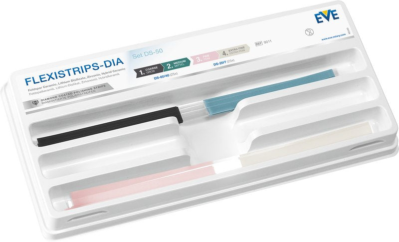 EVE FLEXISTRIPS, Aluminiumoxid. Flexible Finier- und Polierstreifen für Komposite, Kompomere, Glasionomere, Amalgam und für die Reinigung der Approximalräume. Blau = grob - Abtragen und Konturieren. Rot = mittel - Glätten und Vorpolieren. Gelb = fein - Politur. Weiß = extra fein - Hochglanzpolitur.