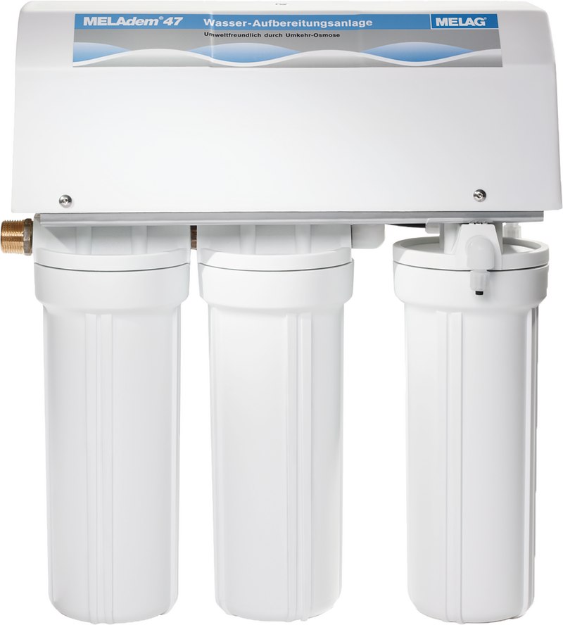 Diese kompakte Wasseraufbereitungsanlage arbeitet nach dem Umkehr-Osmose-Verfahren, eine gute und preiswerte Methode um hochwertiges demineralisiertes Wasser zu erzeugen. Die MELAdem®-Anlagen haben eine lange Laufzeit, je nach Qualität und Verbrauch des Leistungswassers müssen die Patronen und Filter nach 6-12 Monaten (oder sogar später) ausgewechselt werden.