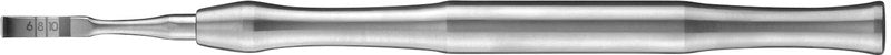 Gerade oder gebogene Ausführung (gerade = Oberkiefer, gebogen = Unterkiefer). Verschiedene Breiten von 3 bis 8 mm, Empfehlung für Einzelzahnimplantate: bis 4 mm Breite größere Kieferkammabschnitte: bis 8 mm Breite. Tiefenmarkierungen auf dem Meißel ab 6 mm bis 10 mm (schwarzer Bereich = Sicherheitsmarkierung ab 10 mm). Empfehlung für den Einsatz: mindest Kieferkammbreite von 2-3 mm, mindest Knochenhöhe von 10 mm, maximale Splittingtiefe bis 70 Prozent der Gesamtknochenhöhe.