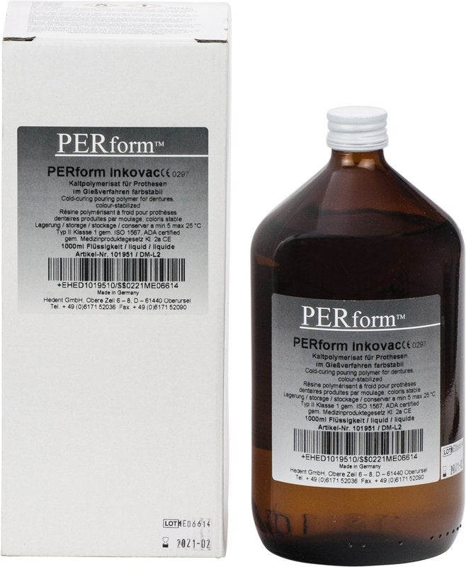 Kunststoff-Warmpolymerisat für Prothesen im Perform-Inkovac-Polymerisationssystem und in der Modellgusstechnik. Perform Kunststoff ist speziell für die Gießtechnik entwickelt worden und zeichnet sich durch besonders gute Fließeigenschaften aus. Es ist ein farbstabiles Polymethymetacrylat mit Barbitursäure-Katalysatorsystem. Restmonomer unter 1 %.