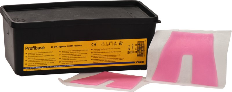 Profibase ist ein lichthärtendes rosa-transparentes Basisplattenmaterial zur einfachen und rationellen Erarbeitung von Wachsaufstellungen. Eine zahnfleischähnliche Farbgebung steigert die Akzeptanz bei Patient und Zahnarzt. Die Basisplatten lassen sich einfach und zeitsparend mit der Hand formen. Überschüssiges Material kann mit einem scharfen Messer abgeschnitten und - ein großer ökonomischer Vorteil von Profibase - wiederverwendet werden. Die Aushärtung erfolgt in einem handelsüblichen Halogenlichtgerät oder unter UVA-Licht. Profibase Basisplatten sind dauerhaft stabil und druckfest und besitzen ein angenehmes Pfefferminzaroma.