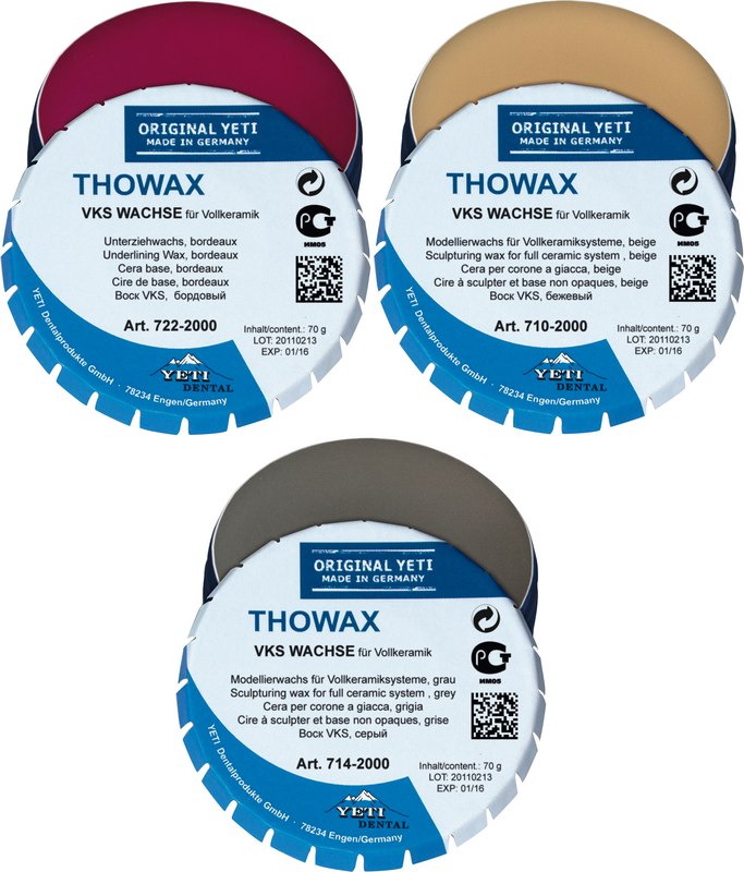 Wachsserie für Vollkeramiksysteme wie z. B. Empress, Dicor oder ähnliche. Absolut frei von opakisierenden Bestandteilen. Unerwünschte Rückstände durch chemische Reaktionen mit der Einbettmasse werden hierdurch verhindert. Durch die hohe Standfestigkeit lässt sich die Zahnform schnell und einfach aufbauen, feinste Charakteristika sind plazierbar.