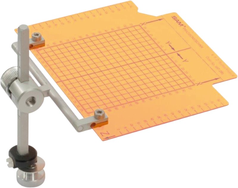 XYZ Koordinaten-Meßtisch zur Beurteilung der Symmetrie von Kieferbögen, zur Bestimmung von Zahnkoordinaten und zur Ausrichtung von Phantommodellen im Artikulator. Für alle SAM Artikulatoren.