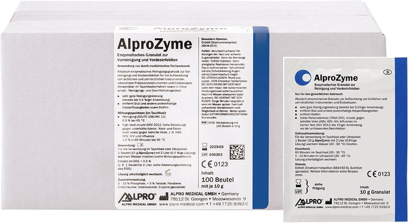 Alkalisch-enzymatisches Reinigungsgranulat zur Vorreinigung und Vordesinfektion für die Aufbereitung von ärztlichen und zahnärztlichen Instrumenten, rotierenden Präzisionsinstrumenten und Endoskopen. Verwendbar im Tauchbadverfahren sowie in Ultraschall-, Reinigungs- und Desinfektionsgeräten. Wirkt High level viruzid (DVV 2012; hohe Belastung) im Tauchbad gegen unbehüllte Adeno-, Noro- und Parvoviren sowie gegen behüllte Viren, z. B. HBV, HCV, HIV und Influenza 1 % in 60 Minuten bei 30 °C .