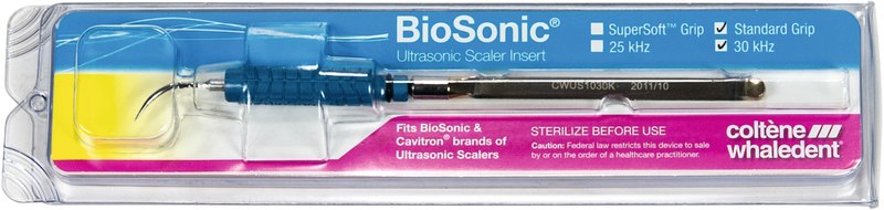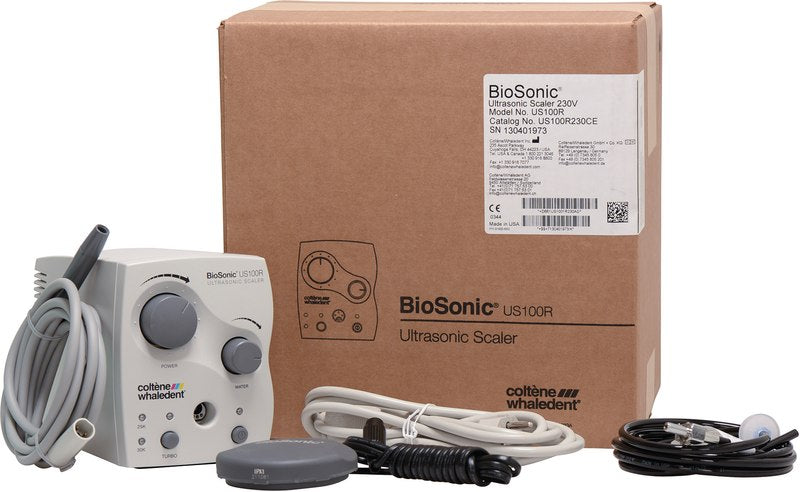 Der BioSonic magnetostriktiver Ultraschall-Scaler nimmt mit seinem einzigartigen Design weniger Standfläche in Anspruch als alle anderen bekannten Marken. Durch den integrierten Turboschalter wird eine Leistungsverstärkung erreicht, um massive Konkremente schneller zu entfernen. Die patentierte Herstellung der Instrumenteneinsätze führt zu einer höheren Sicherheit und längerer Lebensdauer. Der ergonomische Griff verbessert den Anwenderkomfort beim Entfernen von Zahnstein. Alle BioSonic Einsätze passen auch in andere handelsübliche Ultraschall-Scaler. Der Auto Sensor Circuit (ASC) stellt automatisch auf die jeweilige Betriebsfrequenz der 25 kHz beziehungsweise 30 kHz Einsätze um.