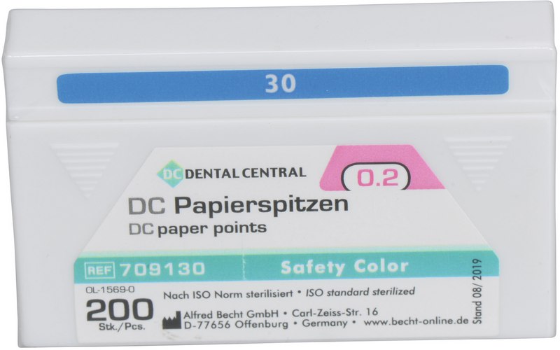 DC Papierspitzen zeichnen sich durch hohe Saugfähigkeit, optimale Festigkeit, glatte Oberfläche und Faserfreiheit aus. Verwechslungssicher in einer Schiebekassette eingeordnet. Teilfarbcodierung an der Spitze. Nach ISO-Norm sterilisiert.