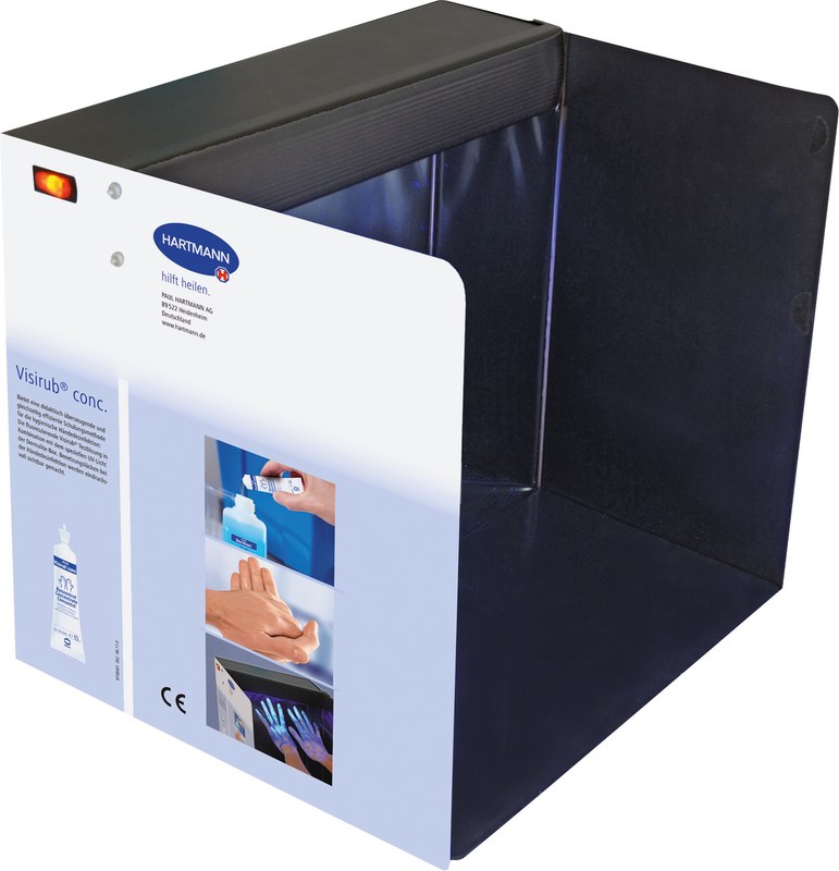 Handliches Schulungstool für den Fluoreszenztest mit UV-Schwarzlicht, inklusive Netzkabel, Visirub conc., Broschüre und Kennzeichnungs-Etiketten. Die Derma LiteCheck® Box stellt in Verbindung mit Visirub® conc., dem fluoreszierenden Konzentrat zur Visualisierung von Benetzungslücken bei der Händedesinfektion, ein Instrument zur Kontrolle der korrekten Einreibetechnik dar.