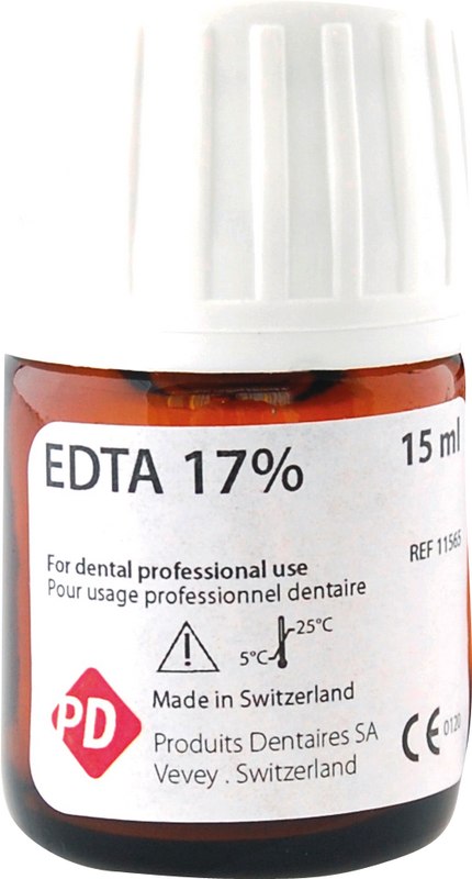 Lösung zur Spülung des Wurzelkanals Gel zur chemischen Erweiterung des Wurzelkanals PD EDTA 17 % besitzt leicht antiseptische Eigenschaften zur Entfernung des smear layers während der Instrumentalisation (Gel) und zur Spühlung (Lösung) des Wurzelkanals. Es wirkt durch chelatisierung 15 mlvon Kalzium-Ionen und durch Entfernung von anorganischen Verunreinigungen.