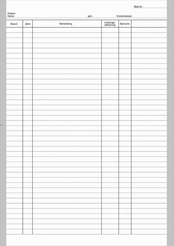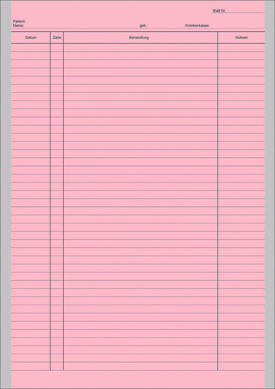 Durch die Spalten Spalten für Datum, Zahn, Behandlung und Notizen gibt es ausreichend Platz, auch zur Eintragung von BEMA-Nr..