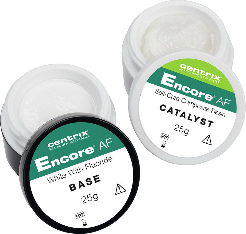 Encore AF ist eine glattere, cremigere Version unseres selbsthärtenden Komposit-Stumpfaufbaumaterials Encore. Die verbesserte Mischung von Hybridglasfüller lässt sich leichter spritzen und besitzt eine höhere mechanische Festigkeit. Erhältlich mit Fluorid und in den Farben Natur und Weiß.
