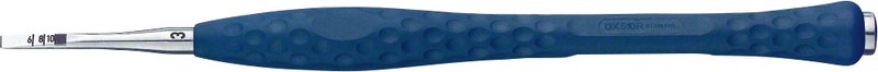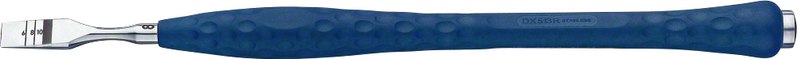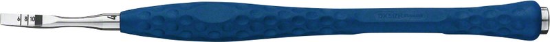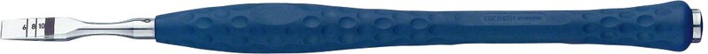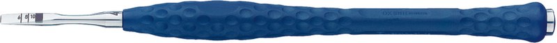 Länge 160 mm. Bei geringer Knochenstärke bis zu 3 mm, kann der Kieferknochen in der Mitte gespaltet werden und durch spezielle Meisel, die sogenannten Osteotome, auseinander gebracht werden. Somit entsteht ein Knochenspalt (Bone split), zwischen bukkaler und lingualer bzw. bukkaler und palatinaler Knochenkamelle. In den "gewonnenen" Knochenspalt kann dann ein Implantat inserriert werden. Das ERGOPLANT Griff Konzept unterstützt den Anwender. Das Stufen-Osteotom wurde speziell zur sicheren Knochenspaltung, bei gleichzeitiger schrittweisen Aufweitung entwickelt. Der Kieferkamm wird zunächst nach palatinal und erst dann nach vestibulär aufgeweitet. Nach Entfernen ist die "Preselektionsstelle" für den Implantatbohrer deutlich zu sehen.