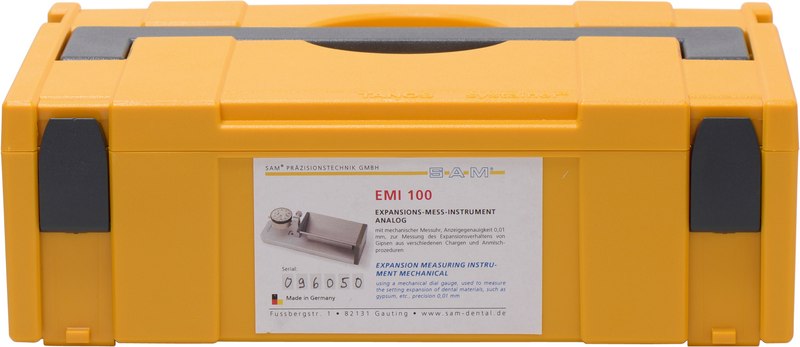 Expansions-Mess-Instrument, analog. Mit mechanischer Messuhr, Anzeige-Genauigkeit 0,01 mm, zur Messung des Expansionsverhaltens von Gipsen aus verschiedenen Chargen und Anmischprozeduren.