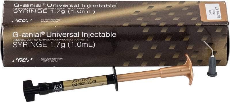 GC G-ænial® Universal Injectable ist ein Universal-Restaurationscomposite mit außerordentlicher Festigkeit und Widerstandsfähigkeit für langlebige ästhetische Restaurationen. Der hohe Gehalt an ultrafeinen Bariumpartikeln und die vollabdeckende Silan-Beschichtungstechnologie (FSC) verleihen GC G-ænial® Universal Injectable außerordentliche Festigkeit - stabiler als führende pastöse am Markt verfügbare Composite. Dank dieser überragenden Eigenschaften ist GC G-ænial® Universal Injectable für sämtliche Kavitätenklassen ohne Abdeckschicht indiziert. Er zeichnet sich außerdem durch eine hohe Röntgenopazität von 252 % aus - ideal für die Nachuntersuchung Ihrer Restaurationen und die einfache Diagnose eventuell vorhandener Sekundärkaries. Die einzigartig hohe thixotrope Viskosität ermöglicht eine Anpassung an jede klinische Situation: Das Material fällt beim Applizieren nicht ein, und verfügt bei der Handhabung mit Instrumenten über eine gute Fließfähigkeit. Zusätzlich wird die Applikation dadurch erleichtert, dass es nicht an der Spitze haftet. Die lange Nadel der Dosierspitzen für GC G-ænial® Universal Injectable lässt sich einfach durch leichten Druck mit den Fingern biegen. So gelangen Sie problemfrei an schwer erreichbare posteriore Kavitäten! Darüber hinaus zeichnet sich GC G-ænial® Universal Injectable nicht nur durch unübertroffene Polierbarkeit und Glanzbeständigkeit aus, sondern ist außerdem in 16 Farben und drei Transluzenzstufen erhältlich und sorgt damit für eine hervorragende Langzeit-Ästhetik.