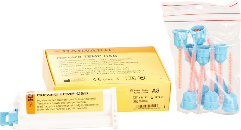 Harvard TEMP C&B ist ein selbsthärtendes Composite-Material zur Erstellung von provisorischen Kronen, Brücken, Inlays, Onlays und Veneers. Wegen seiner hohen Endhärte und Elastizität ist TEMP C&B auch für die Herstellung großer Brücken hervorragend geeignet. Das Material ist bereits nach 4:30 min ausgehärtet. Der geringe Temperaturanstieg bei der Polymerisation (+3,6 %) ist dabei schonend für die Pulpa und nicht unangenehm für den Patienten. Bei Beschädigungen am Provisorium kann das Material selbst zur Reparatur genommen werden. Die natürliche Fluoreszenz und die gute Auswahl an Farben gewährleisten ästhetische Provisorien.