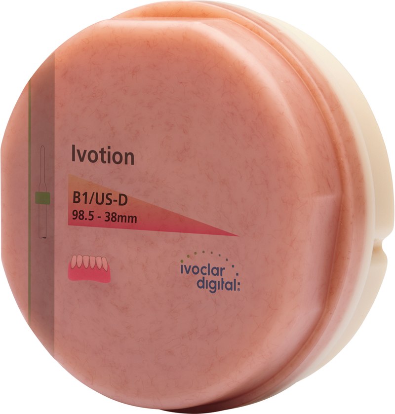 Das Ivotion Denture System ist ein kompletter Herstellungsprozess zur schnellen digitalen Fertigung von hochqualitativen abnehmbaren Prothesen. Der abgestimmte Workflow verknüpft die digitale Fertigung im Labor mit den etablierten zahnärztlichen Behandlungsschritten. Im Zentrum des Systems steht Ivotion, die neue monolithische Scheibe, die Zahn- und Prothesenbasismaterial kombiniert. Ivotion kombiniert Zahn- und Prothesenbasismaterial in einer Scheibe. Mit Ivotion ist es möglich, digitale Prothesen aus einer einzigen Scheibe in einem ununterbrochenen Fräsvorgang zu fertigen, ohne aufwendige manuelle Arbeitsschritte. Verfügbar in verschiedenen Ausprägungen