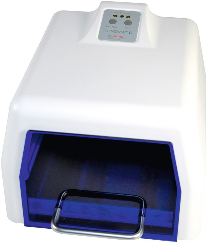 Ein leistungsstarkes Lichtpolymerisationsgerät zum Aushärten lichthärtender Dentalmaterialien wie universelle Abformlöffel, Versiegelungslacke sowie Ausblockmaterialien. Der Polymerisationsraum bietet ausreichend Platz für die Aufnahme von bis zu 4 Modellen. Durch die im Halbkreis angeordnete Kombination von je 2 UVA- und Blaulichtröhren, ergibt sich ein homogenes Polymerisationslicht für die Aushärtung der lichthärtenden Kunststoffe. Wahlweise durch LED angezeigte Aushärtezeiten von 5 Minuten, 10 Minuten oder Dauerbetrieb.