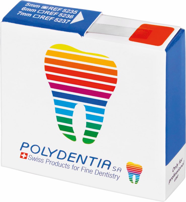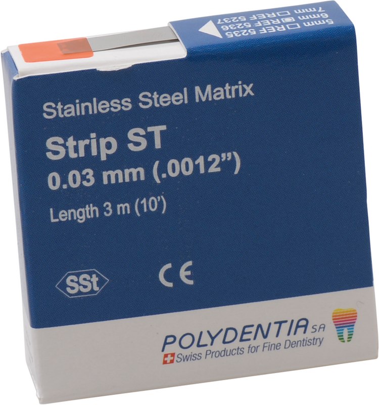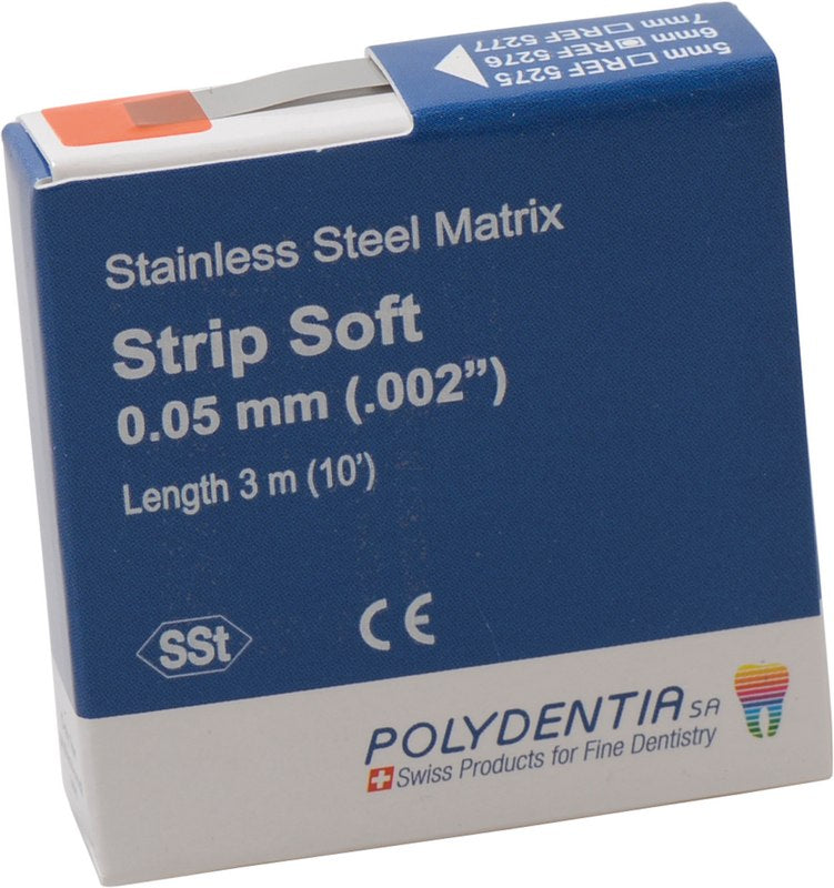 Soft: Aus weichem rostfreiem Stahl (bleitot), 0,05 mm dünn, ermöglicht das Brünieren der Matrize, die Weichheit des Bandes erlaubt eine vollständig an den Zahn angepasste Formgebung und gute Kontaktpunkte
