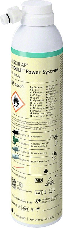 Zur Pflege von Aesculap-Motorensystemen vor der Dampf-Sterilisation. Keine Beeinträchtigung der Sterilisationswirkung durch den Ölfilm. Schmierwirkung und Korrosionsschutz. Vor der Anwendung von Sterilit zu schmierenden Artikel entsprechend Gebrauchsanweisung aufbereiten. Für die Benutzung des Ölsprays sind handstück- und motorenspezifische Sprühadapter erforderlich. Silikonfrei. Nur vor der Sterilisation anwenden. Lieferung ohne Adapter.