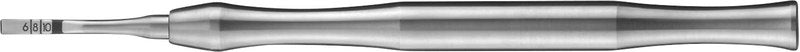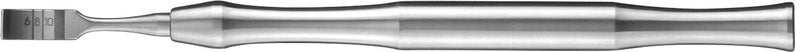 Gerade oder gebogene Ausführung (gerade = Oberkiefer, gebogen = Unterkiefer). Verschiedene Breiten von 3 bis 8 mm, Empfehlung für Einzelzahnimplantate: bis 4 mm Breite größere Kieferkammabschnitte: bis 8 mm Breite. Tiefenmarkierungen auf dem Meißel ab 6 mm bis 10 mm (schwarzer Bereich = Sicherheitsmarkierung ab 10 mm). Empfehlung für den Einsatz: mindest Kieferkammbreite von 2-3 mm, mindest Knochenhöhe von 10 mm, maximale Splittingtiefe bis 70 Prozent der Gesamtknochenhöhe.