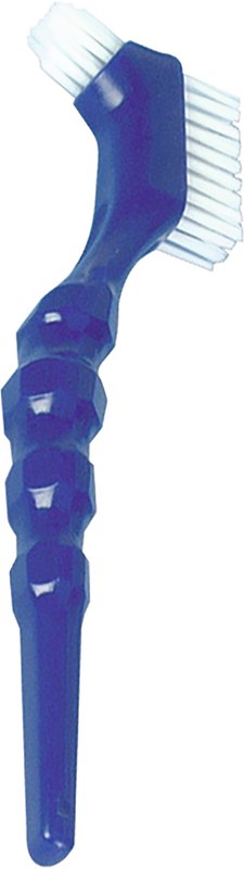 Prothesenbürste mit zwei Bürstenköpfen: großes Borstenfeld zur Reinigung der Außenseiten, kleinerer Kopf zur Reinigung der Protheseninnenseiten. Ergonomisch geformter Fingerformgriff.