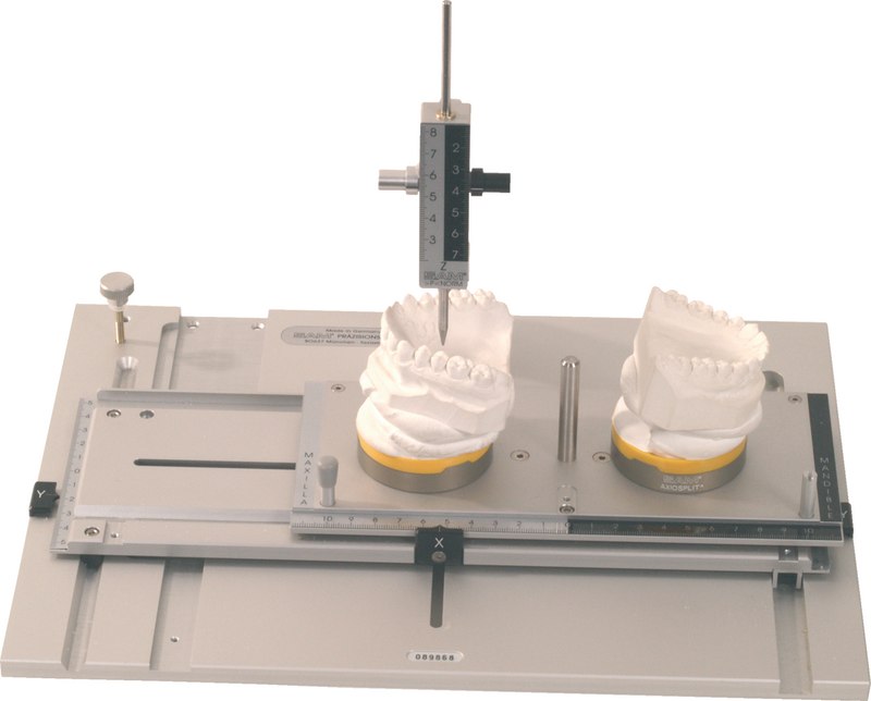 Kreuztisch mit Skalen für alle drei Koordinaten. Dreidimensionale Vermessung von montierten Ober- und Unterkiefer-Modellen, Referenzebene ist die Achs-Orbital-Ebene, Vergleich und Festlegung korrespondierender Punkte in der Okklusion oder Kieferkamm, auch für Planung in Implantologie und Kieferorthopädie.