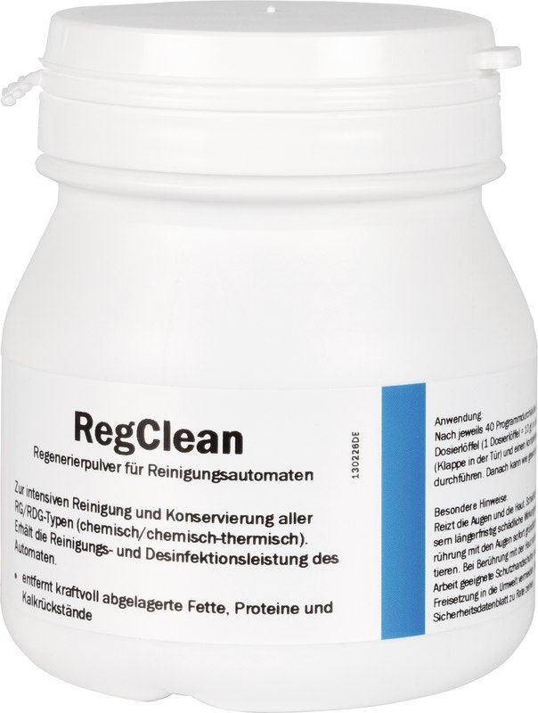 RegClean dient zur intensiven Reinigung und Regeneration von Reinigungs- und Desinfektionsgeräten RG/RDG (chemisch/chemisch-thermisch) und zum Erhalt der Leistungsfähigkeit der Geräte. RegClean entfernt kraftvoll die sich mit der Zeit abgelagerten Knochenmehl-, Gewebe- und Kalkrückstände in Spülarm und Filter des RG/RDG.