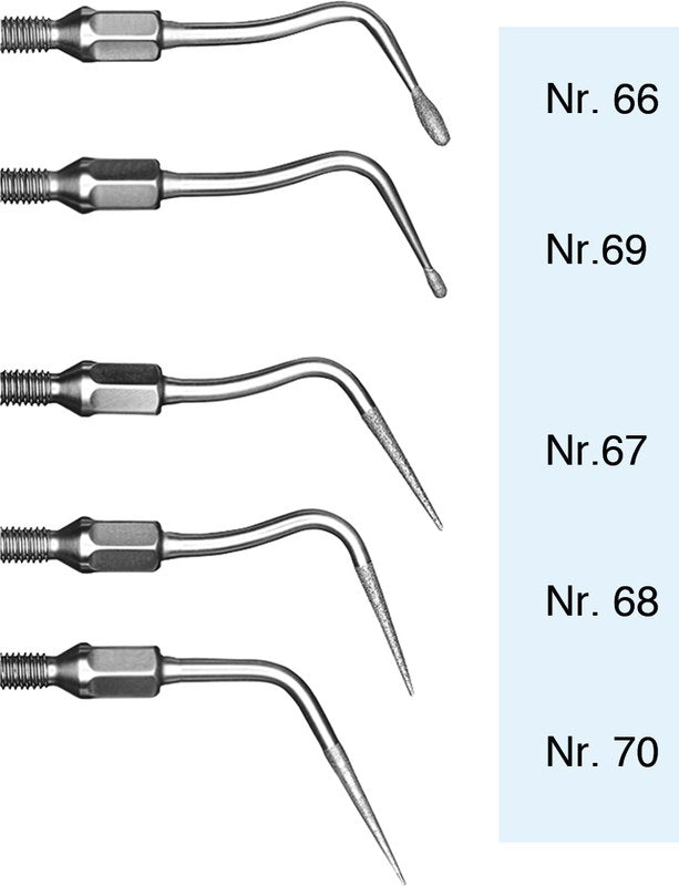 Ausgestaltung des Pulpenkavums zur koronalen Wurzelaufbereitung, Suche der Kanäle, Präparation der Kanaleingänge sowie entfernen von weichen Materialien bei Revisionen. Wichtiger Hinweis: Alle aufgeführten KaVo SONICflex Spitzen dürfen nur auf KaVo SONICflex 2000 N/L und 2003 L/LX/NX benutzt werden. Für das neue SONICflex 2008 L/LS werden die Spitzen zwar mit der gleichen Hersteller-Nummer, allerdings mit der zusätzlichen Kennzeichnung A verwendet.