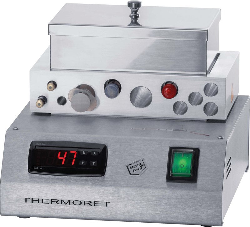 Wasserbad und Wärmegerät. Spritzen oder Karpulen können in einem Materialblock vorgewärmt werden. Komposite z. B. werden dadurch fließfähiger und lassen sich einfacher verwenden. Außerdem lässt sich mit dem THERMORET beispielsweise Natriumlösung zum Spülen der Wurzelkanäle auf die gewünschte Temperatur bringen. Auch Instrumente, wie Spatel oder Sonden, können mit dem Heizplattengerät für den alltäglichen Praxisgebrauch erwärmt werden – für den Patienten also weniger wahrnehmbar. In der Edelstahl-Box lassen sich Wachsplatten vorwärmen und sie ist als Wasserbad nutzbar. Die Temperatur des Gerätes lässt sich über ein leicht zu bedienendes Display aufs Grad genau von 0 bis 70 °C regeln. Edelstahl-Box kann im Thermodesinfektor desinfiziert werden.
