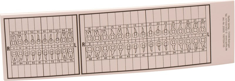 Ob für Milchzahn-, Wechsel-, oder Erwachsenengebiss – dieser Aufkleber bietet Ihnen genügend Platz für einen ausführlichen 01-Befund.